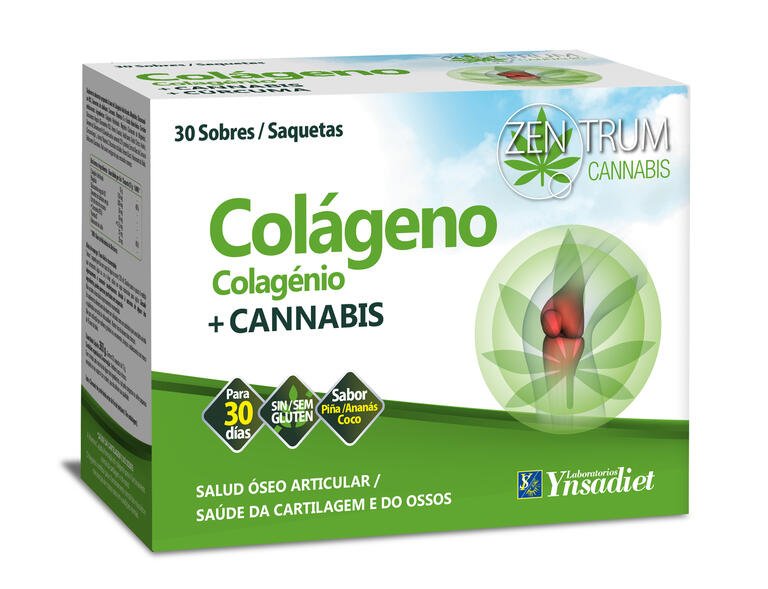 Para la protección y prevención del deterioro de huesos, cartílagos y articulaciones lanzamos un nuevo complemento, el Colágeno de la gama Zentrum Cannabis, que contiene ingredientes conocidos fundamentalmente por contribuir a cuidar la salud óseo-articular: • Colágeno hidrolizado: ya que la hidrolisis permite que los péptidos de colágeno se asimilen fácilmente y estimulen la síntesis de nuestro propio colágeno, regenerando los tejidos que lo contienen. • Glucosamina: sustancia presente en los cartílagos, que aporta hidratación y elasticidad, ayudando al buen funcionamiento articular. Además, posee efecto antiinflamatorio. • Ácido hialurónico: ejerce un efecto sinérgico con el colágeno para reconstituir los tejidos e hidratar las articulaciones. • Boswellia: conocida por su poder antiinflamatorio y su buena tolerancia a nivel intestinal, la hace muy recomendable en dolores crónicos; colabora en el mantenimiento de las articulaciones. Y el • Cáñamo: complementa la acción de la Boswellia. • Vitamina C y magnesio: necesarios para asegurar la correcta producción de colágeno